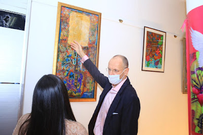 Mike Nithavrianakis, British Deputy High Commissioner in Karachi, elaborated on the Arthurian Celtic Legend portrayed in the painting. Enrico Alfonso Ricciardi from the Consulate of Italy in Karachi, remarked on the Italian cultural depiction in the paintings while Ashida Katsunori (Noori) from Consulate of Japan in Karachi gave his impressions on the painting showing twin Koi fish in white and green colours.