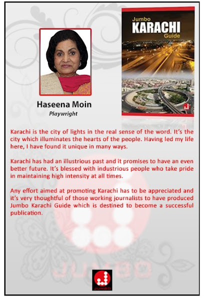 Any effort aimed at promoting Karachi has to be appreciated and its very thoughtful of those working journalists to have produced Jumbo Karachi Guide which is destined to become a successful publication, Haseena Moin had remarked in her comments which were published in the Words of Encouragement section of the guide in its third edition in 2013.